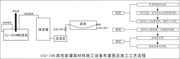 制漿過程必須使用湖北中橋科技有限公司研制的ZJ-400W型高速制漿機(jī),首先加入適量的水清洗設(shè)備,同時(shí)起到潤(rùn)濕桶壁的作用。然后加水至制漿機(jī)81kg刻度線位置,開啟攪拌泵和循環(huán)泵,勻速加入300kg(12包)灌漿料,加料過程制漿機(jī)應(yīng)處于工作狀態(tài),投料完畢后攪拌3~5min,將漿體導(dǎo)入儲(chǔ)漿桶攪拌直至壓漿完畢。